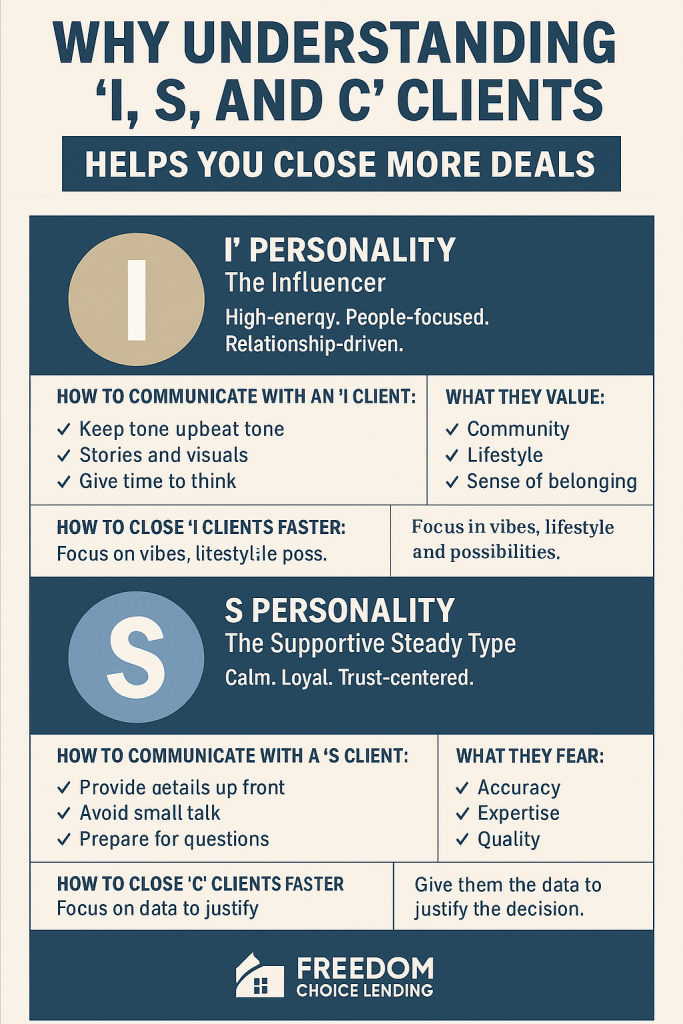 Understanding I, S, and C clients allows you to lead with clarity, intention, and connection—all while making the homebuying process feel easier, smoother, and more personalized.
